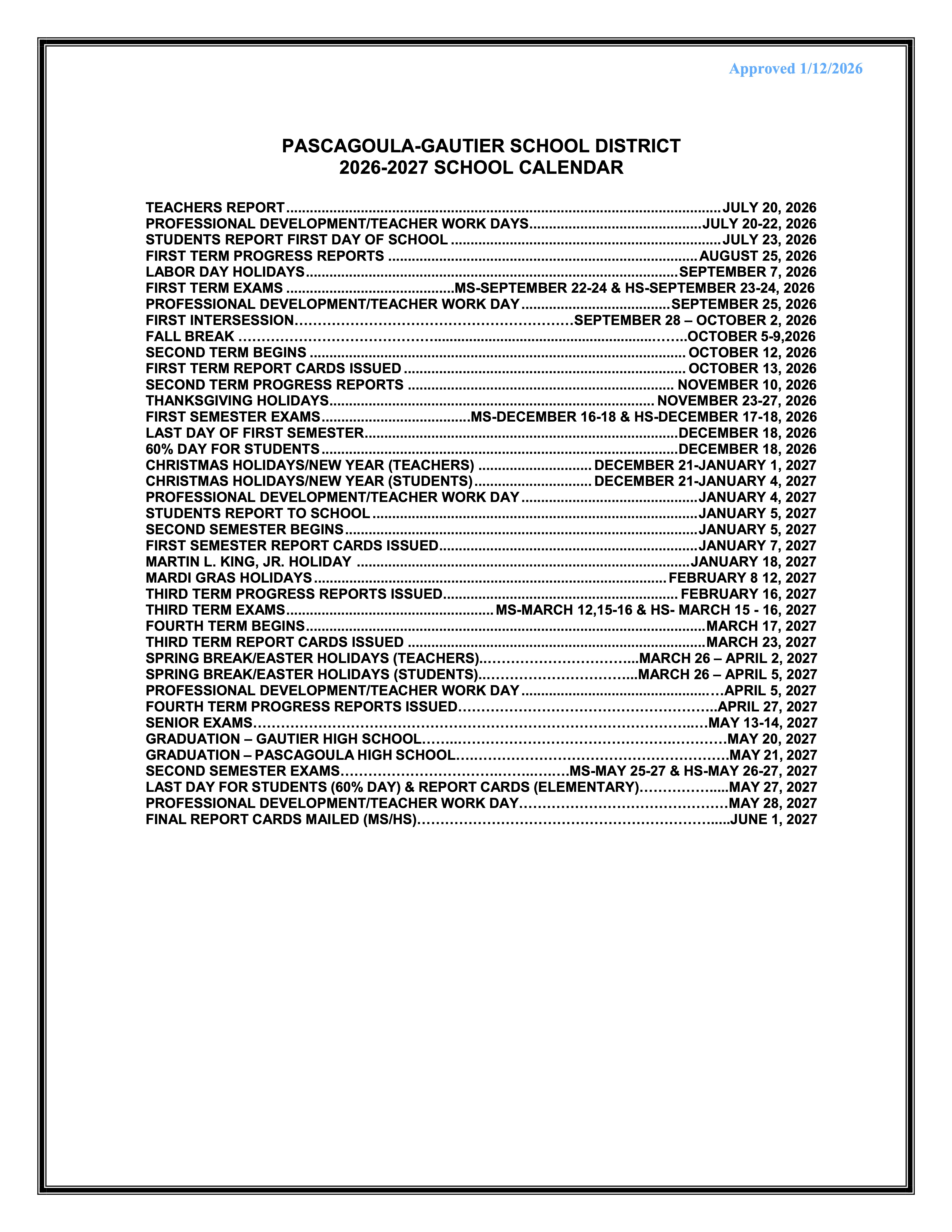 February 2, 2026 📅 ICYMI: PGSD 2026–2027 School Calendar is here! The Pascagoula-Gautier School District’s 2026–2027 School Calendar was approved at the January Board meeting and is now available for families to plan ahead.Key dates at a glance:• First day for st...